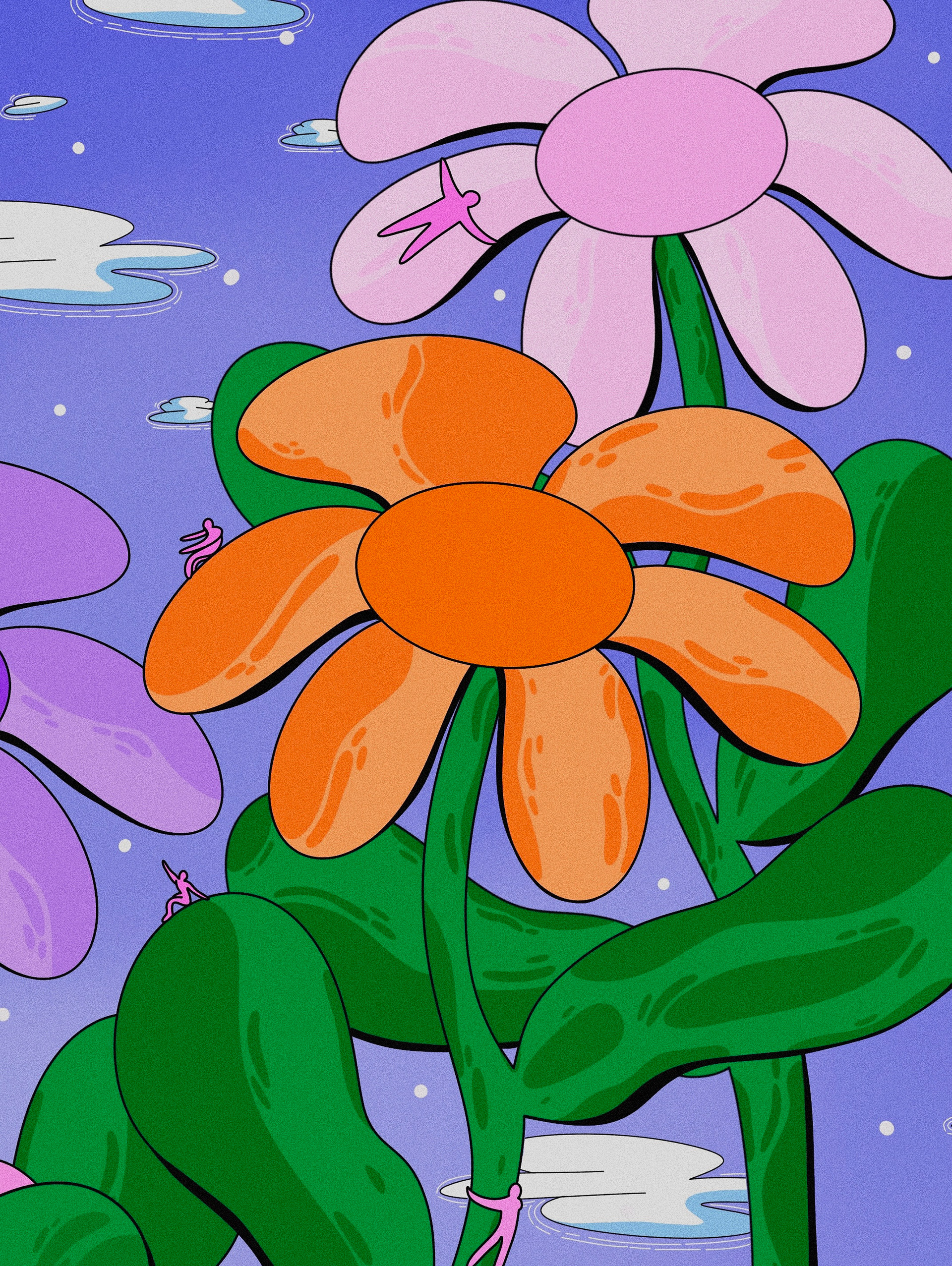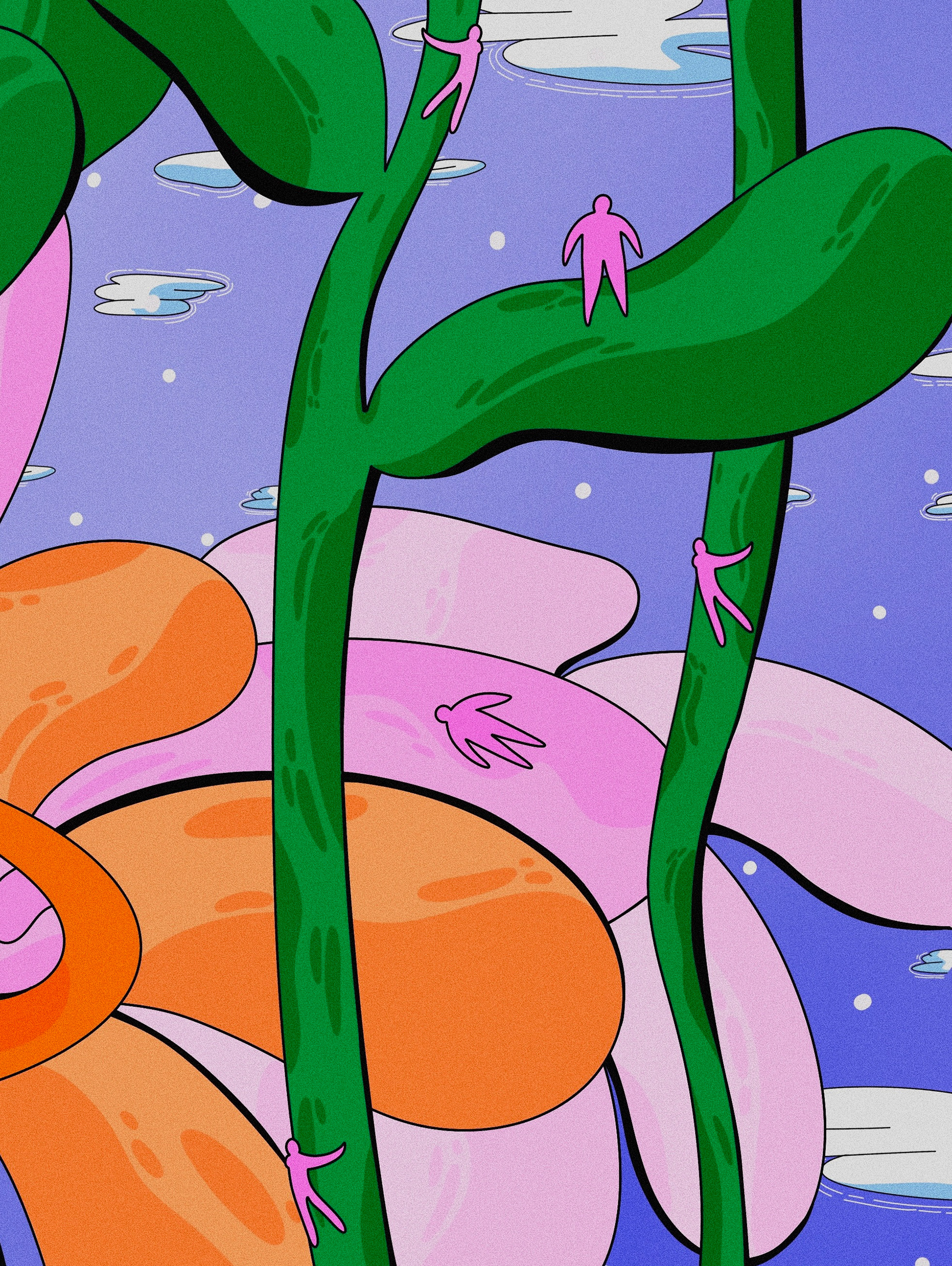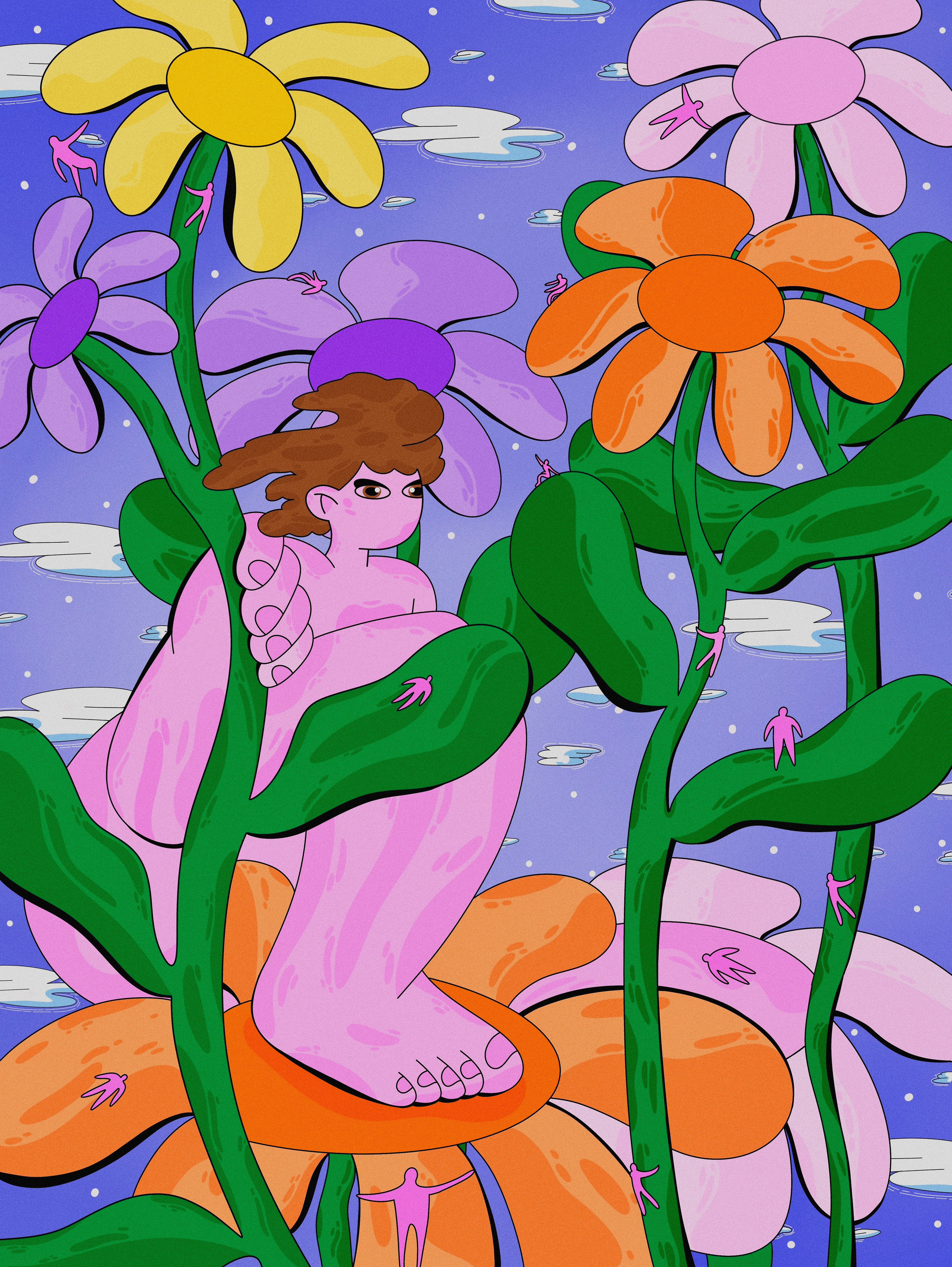 This illustration was born from a quiet reflection on the emotional process of growing up. I imagined what it would feel like if we could walk through our own memories — each flower representing a moment, each petal a feeling, each leaf a life lesson. The large, pink figure in the center represents a vulnerable, evolving self. The tiny pink bodies climbing, falling, and reaching out are fragments of who we once were — the versions of us that kept trying even when things felt uncertain or painful. I created this piece digitally, using bold lines and vibrant colors to evoke a sense of both playfulness and emotional depth. My goal was to visualize inner growth as something organic, surreal, and filled with quiet strength. Even when we feel small or lost, we are still moving forward — blooming in ways we don’t always see right away.